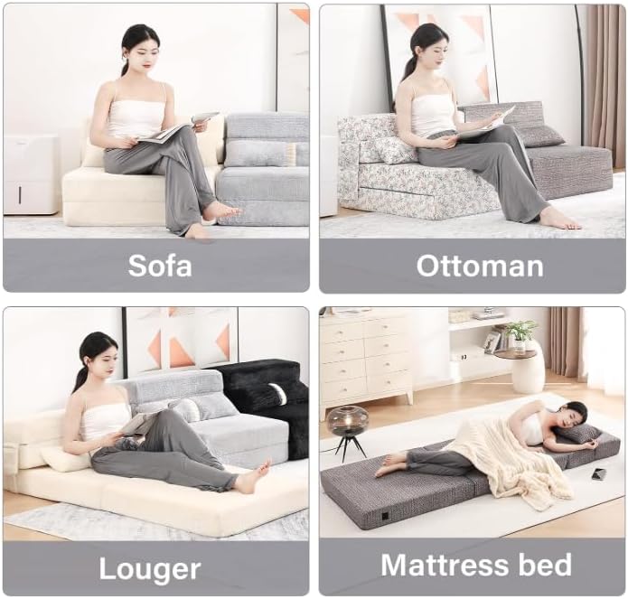 Poppins HOME Convertible Folding Sofa Bed 2-in-1 Compact Sleeper Chair with Pillow for Small Spaces, Guest Room, Office, Comfortable Fabric (Grey, Twin – 78.7″D x 38.1″W x 6″H)