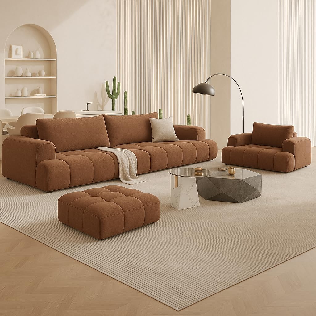 Poppins HOME Modern Upholstered Sectional Sofa with Tufted Cushions Italian Minimalist Modern Design Furniture Fabric Lounge Couch Corner Set Furniture Living Room (Brown, 1 Seater+Ottoman)